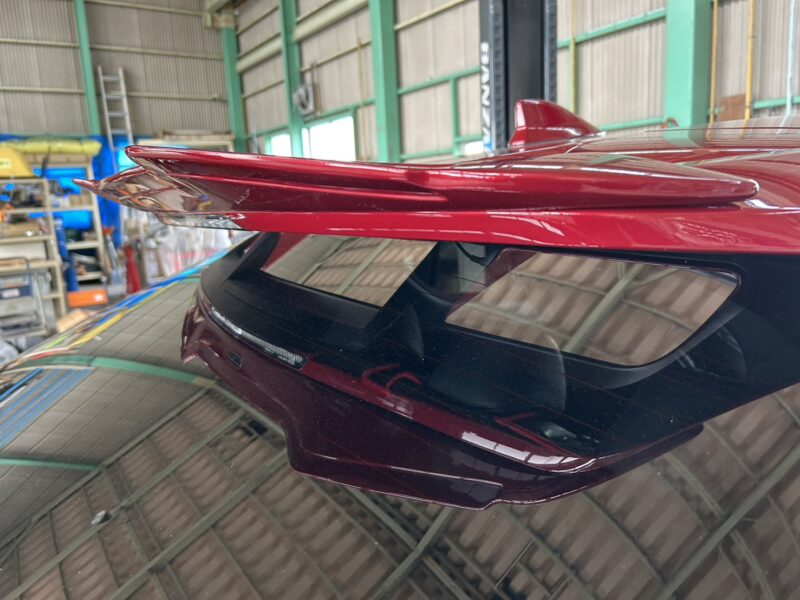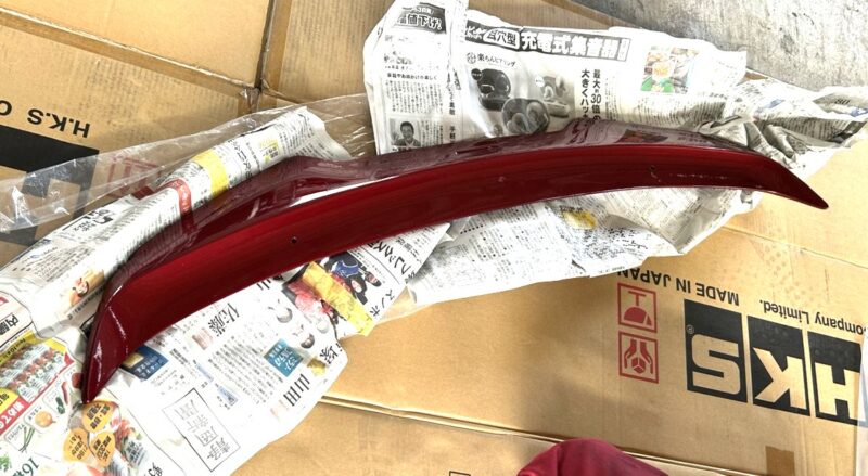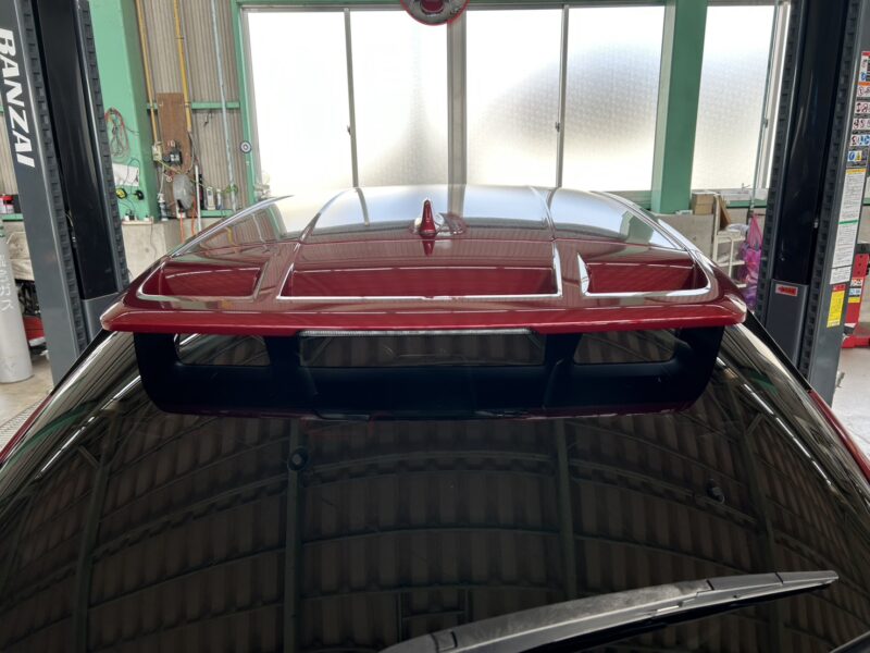 あらかじめ、持込みいただいた素地のルーフスポイラーを車体と同色に塗装しました。 こちらを取付けていきます。